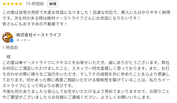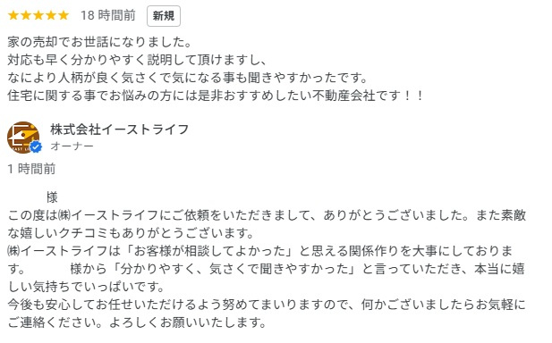 この度は自宅の売却で大変お世話になりました!迅速な対応で、素人にも分かりやすく納得です。次も何かある時は絶対イーストライフさんにお世話になりたいです!